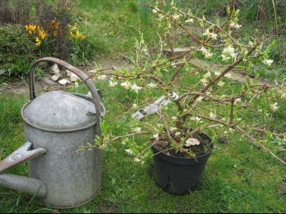 My last-minute purchase, grabbed from beside the payment hut, like a chocolate bar from a check-out, was Lonicera fragrantissima, in full bloom and smelling sweetly gorgeous. It's also only about 18 inches high. The owner made a shrewd assessment of me, and kindly explained that it was easy to keep in check at about 4ft if I pruned it before it got too big.