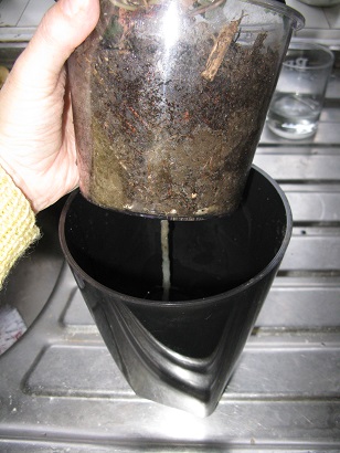 The Glossy pot has been a new experience for all of us. Shiny black, 7 inches (18 cms) tall, it contains a clear plastic pot that slips into the top and a thick string that exits the internal pot and dangles in the water reservoir.