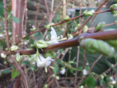 I've had this Winter honeysuckle (aka rather enchantingly as Breath of Spring) since the beginning of 2011, when after an impulse purchase I feared I'd made a mistake. Its final position was on an east-facing fence, in full sun, where I hoped it would hide the compost bins and provide early fragrance on sorties to fill them.