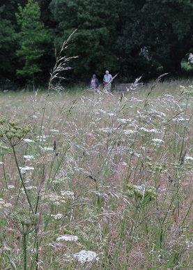 Pearson's design is a simplification of Trellis, with three large "pools" of wildflowers - Shirley poppies, corncockle, gypsophila, blue cornflowers and other colourful annuals - representing the roses in the Morris design, set in a meadow of perennials (these were not yet in bloom, thanks to the cold spring, when I visited in June). Fancifully, you can regard it as a living rendition, with the birds in the design represented by the living birds that inhabit the trees in the meadow.