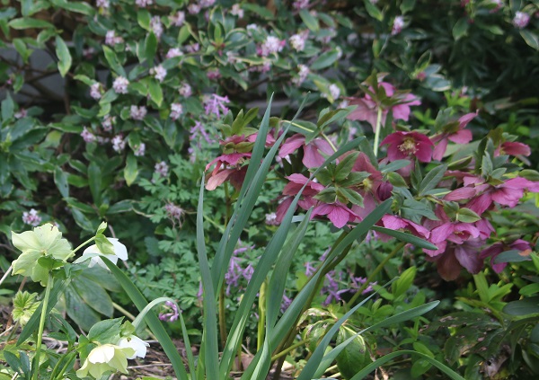 Planted around five years ago,the daphne is around four feet high and making a useful mound at the back of the bed. Meanwhile, the hellebores have been flowering their hearts out.