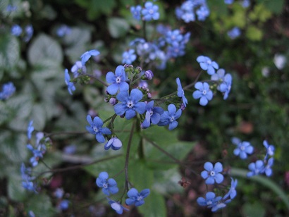 Over at my father-in-law's house, the forget-me-not is completely different. It has rougher, heart-shaped leaves, is perennial, has spread freely, and is a pig to pull up. Husband has just spent days - yes, days - wrestling with roots systems that grow into thick, tough clumps, and don't like to leave the ground. This is not Myosotis, but the false forget-me-not, Brunnera macrophylla or Siberian bugloss - the flowers are remarkably similar, although they lack Mysotis's cheerful splash of yellow in the eye of the flower, and the blue seems just a touch duller.