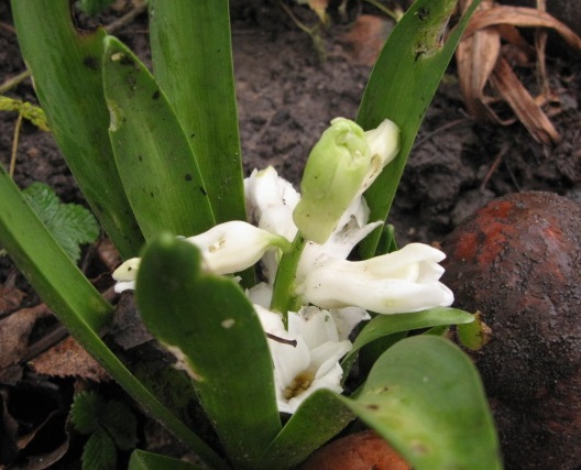 And here's a hyacinth that I planted out last year after having it indoors. Oddly, it's got exactly the same problem as the ones I grow every year over Christmas: the flower blooms before the stalk grows. I thought it was to do with room temperature. Oh, perhaps temperature has, indeed, affected it.