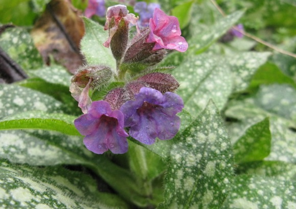 Back to the garden. The pulmonaria are looking rather shy, with various rather short plants displaying gentle colours.