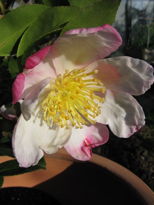 It was originally planted by my father (who loved roses and was always rooting cuttings in jars), which means it must have arrived in the garden in the 70s or early 80s. It's a rambler, fuchsia-pink (as you can see) with clusters of smallish-sized flowers, not repeat blooming, but flowering over several weeks (it's just gone over now, but we've had at least a month of flowers). Not really very scented.