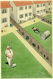 In this one - The Rollers, from The Strand Magazine 1933 - note how the skinny little gardener is making up for the lack of his neighbour's bulk with a great big roller. Or is he just skinny because of all that energy expended?
