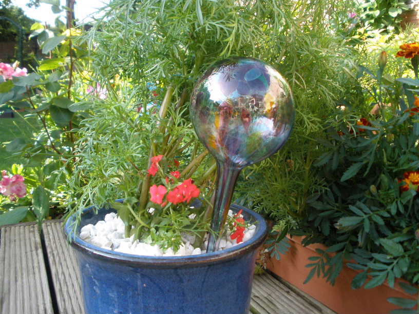 The Glossy pot has been a new experience for all of us. Shiny black, 7 inches (18 cms) tall, it contains a clear plastic pot that slips into the top and a thick string that exits the internal pot and dangles in the water reservoir.